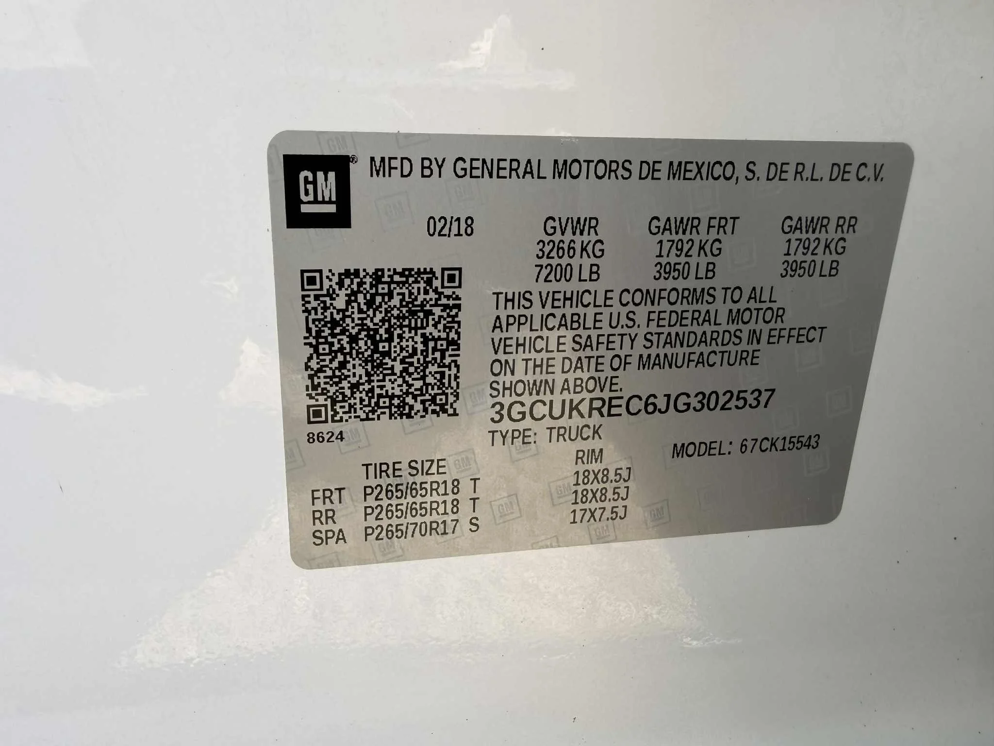 VIN: 3GCUKREC6JG302537